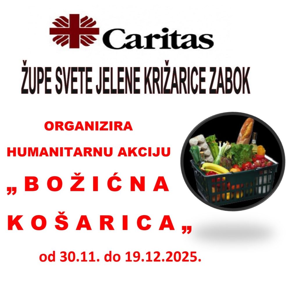 Caritas župe svete Jelene Križarice iz Zaboka organizira akciju „Božićna košarica“ kako bi uljepšali Božić obiteljima slabijeg materijalnog i imovinskog statusa. Kroz ovogodišnje Došašće biti će postavljene košare u trgovinama, od nedjelje 30. studenoga pa do petka 19. prosinca, za pomoć najugroženijim obiteljima. Cilj akcije je prikupiti hranu i osnovne higijenske potrepštine te ih donirati…